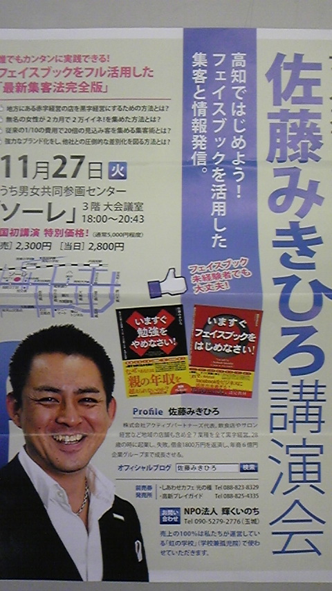 × [PR]上記の広告は3ヶ月以上新規記事投稿のないブログに表示されています。新しい記事を書く事で広告が消えます。 頂きました。最近「フェイスブックやってますか?」と、 聞かれる事が増え、興味深々で参加しました。 会場の40%はわたくしの様な未経験者でした。 フェイスブック場では、役立情報を提供する事が 大切と教えて頂き、このブログにも通じる事があって 学びも多かったです。 講師のお話は良かったのですが、次に現れたのが、 フェイスブックを始めて半年で、本業には関係なく、 お金を儲けるようになった!と言う「うさんくさい」女性のお話がありました。 一気に前のめりでうなずく方々、サーっと引いて聞いている方々、 観ていると二分されている様でした。フェイスブックの良さは理解出来ましたが、 残念な講演でした。楽して儲けても、悪銭身に付かずと思いました。 |